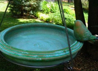 In a soft teal earth tone, featuring adorable bird detail, this hanging bird bath is a stylish addition to any garden setting or landscape.